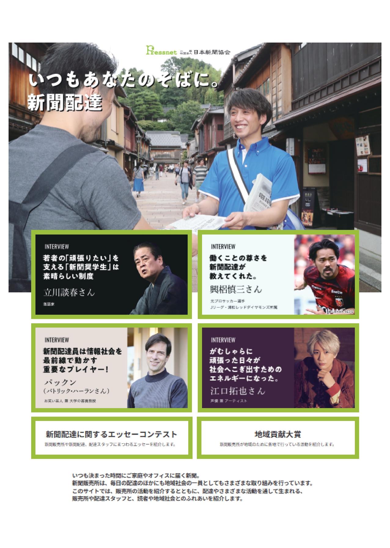 友人が新聞配達をしていて自身も新聞配達をはじめた「プロサッカー選手興梠慎三氏」、厳しい家計を助けるため10歳から8年間に亘り新聞配達をした「お笑い芸人・大学客員教授パックン氏」および、声優・俳優科に通う専門学校時代に新聞奨学生だった「声優・アーティスト江口拓也氏」にインタビューしたオンライン記事を公開しました!